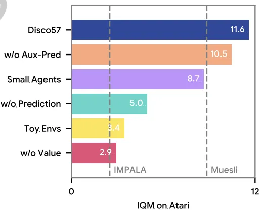 在雅达利基准测试中,这个完全由AI自主发现的规则Disco57,“在成熟的雅达利基准上超越了所有现有(2024年末)的(人类设计的)规则” 。它不仅击败了包括MuZero在内的所有SOTA算法,而且在实际计算时间上也远超MuZero 。