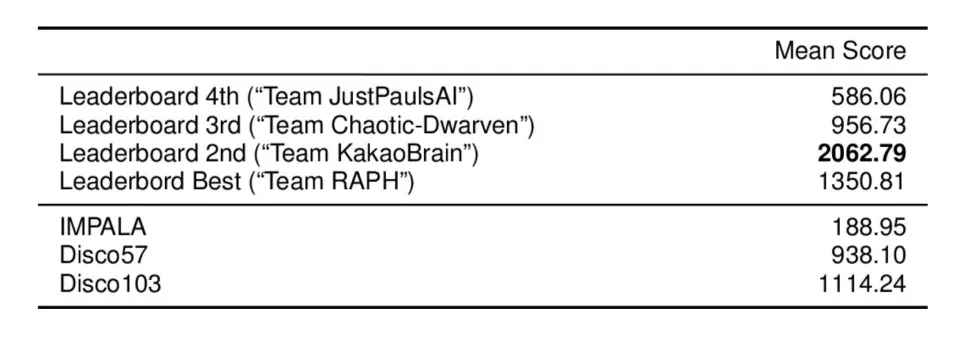 NetHack 挑战赛: 这是一个以高难度和复杂性著称的黑客游戏。DiscoRL在2021年NeurIPS挑战赛中获得了第三名 。而且,它没有使用任何为该游戏定制的领域知识(比如奖励塑造或子任务定义),而这些是人类获胜团队所依赖的技巧 。