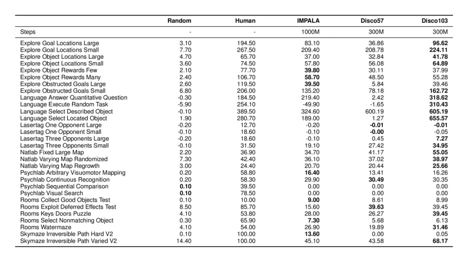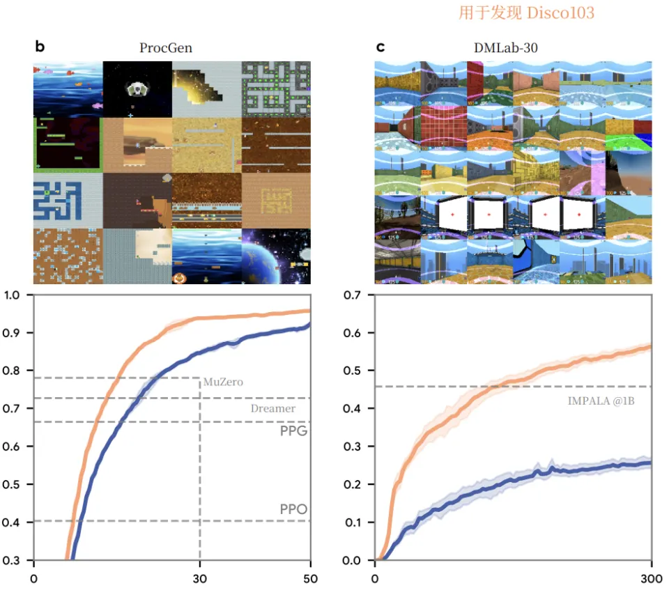 更进一步,当他们用更复杂、更多样化的环境(包括Atari、ProcGen和DMLab在内的103个环境)去训练“老师”时,诞生的Disco103规则,在所有未见过的基准测试上表现得更加强大 。