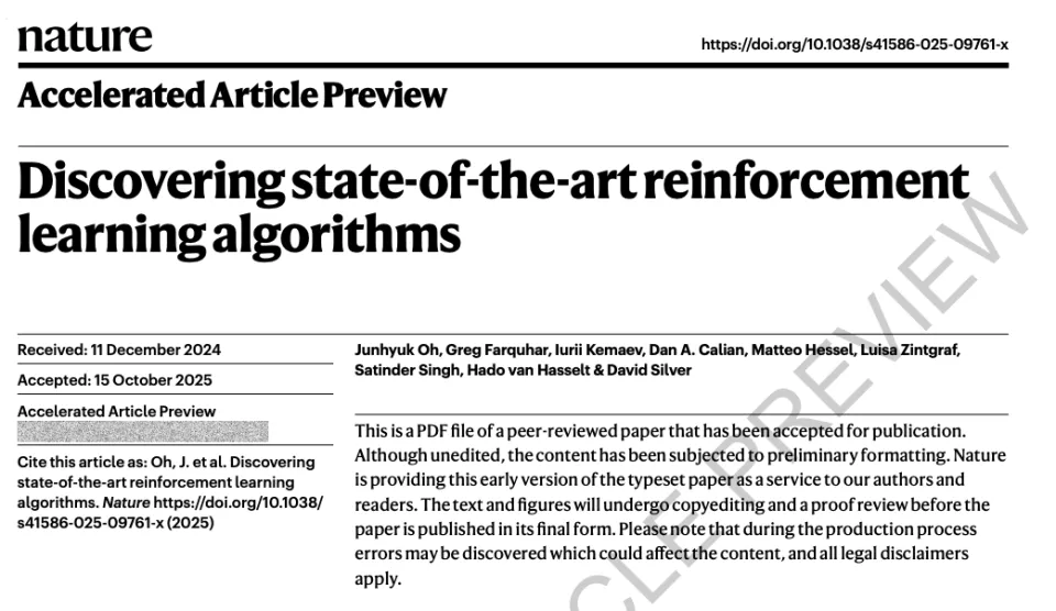 几个月前,强化学习之父Richard Sutton曾公开指出当前大语言模型缺乏持续学习能力。2025年10月22日,DeepMind在《Nature》上发表的一篇题为《Discovering state-of-the-art reinforcement learning algorithms(发现最先进的强化学习算法)》的论文,似乎正是对这一批评的直接回应。