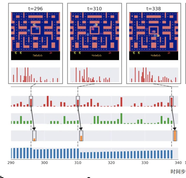 相反,它们会很精细地在事件发生之前对预测进行调整。比如,这些预测会在显著事件发生前出现峰值。在《吃豆人》中,它们在吃到大力丸前会兴奋;在《打砖块》中,它们则是在AI突然决定要往左、右走时出现峰值。 由此,模型便更准确地预测即将到来的大型奖励。这表明发现的预测可能捕获了策略和价值函数未能很好捕获的独特任务相关信息。