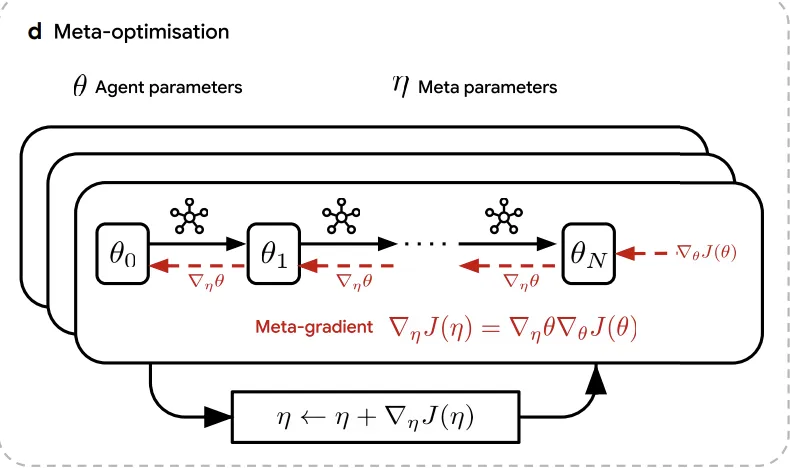 为了做到这一点,老师也需要一个反馈信号,这个信号在技术上被称为元梯度。这个信号需要回答一个非常复杂的问题:“我应该如何调整我的‘学习指南’,才能让学生们最终变得更强?”
