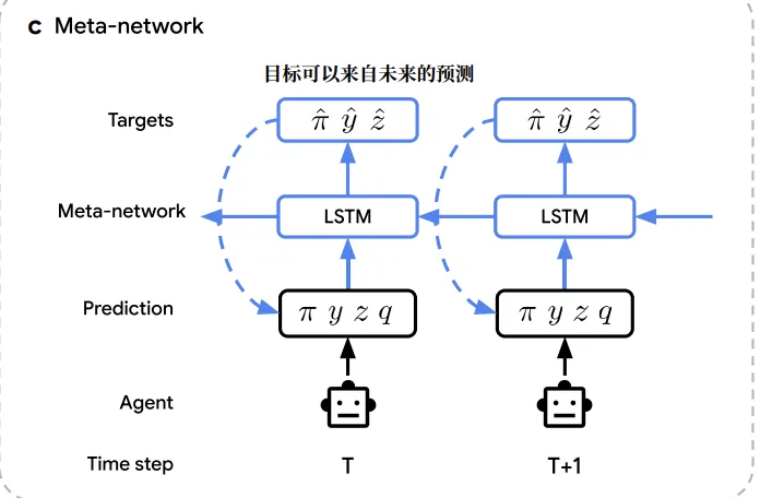 这样的结构,给了元网络一个空间,让它专注于在策略这个更抽象层的探索,比如学习方法。而且因为学习的效果本身依赖于Agent和元网络的一系列相互依赖的更新过程。没有递归,就无法做正确的因果归因与长程优化。