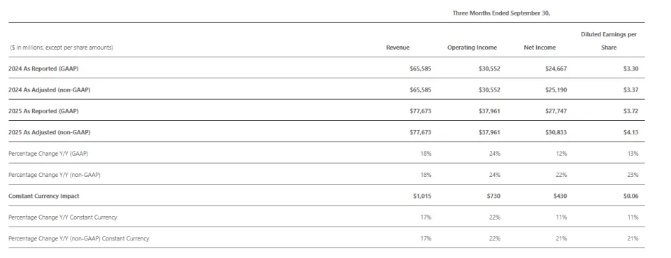 财报显示,微软第一财季营收为776.73亿美元,同比增长18%;净利润为277.47亿美元,同比增长12%,按固定汇率计算(不按照美国通用会计准则),净利润为308.33亿美元,同比增长22%;每股摊薄收益为3.72美元,同比增长13%,按固定汇率计算(不按照美国通用会计准则),每股收益为4.13美元,同比增长23%。