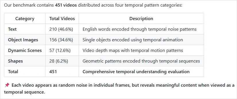 这项研究设置了一个基准,叫做SpookyBench,合成了一堆由噪点组成的视频,是黑白的。