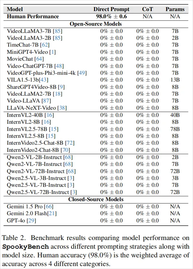 无论模型架构大小、训练数据规模、是否经过微调或采用何种提示策略,AI从未答对任何一段视频的内容。