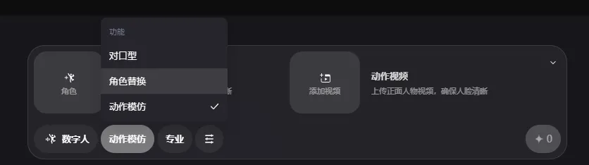 然后选择角色替换或者动作模仿,选择专业模式输出,再上传参考图和参考视频,就OK了。