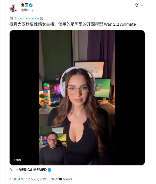 其实Wan2.2 Animate一个月前刚发布的时候就火过一波,不知道你们对这个宅男变身女主播的视频眼熟不,当时我刷到了n次。