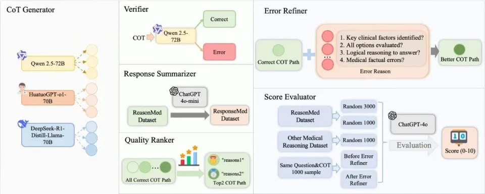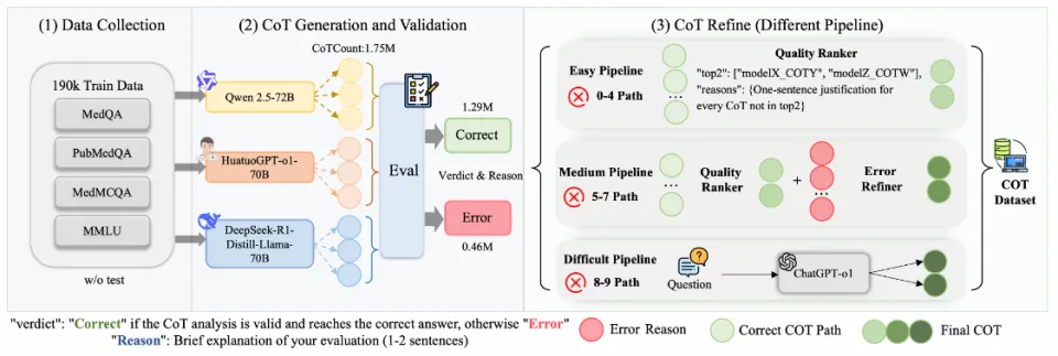 数据匮乏:现有医学领域思维链数据规模较少,且缺乏一个流水线来批量构建一个高质量大规模医学推理数据集;