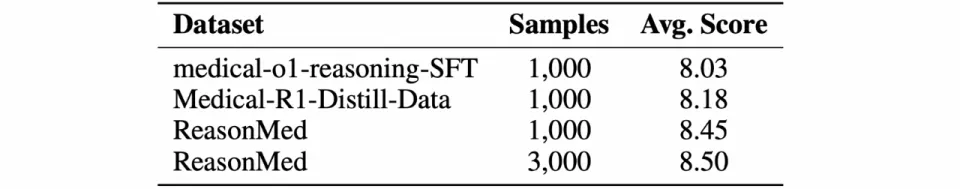 结果表明,ReasonMed 在评分均值上显著优于现有公开数据集,验证了 ReasonMed 框架的有效性。