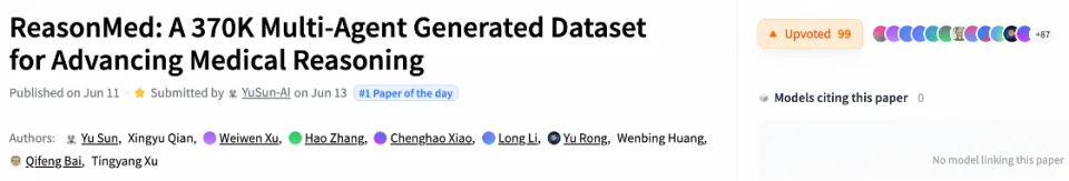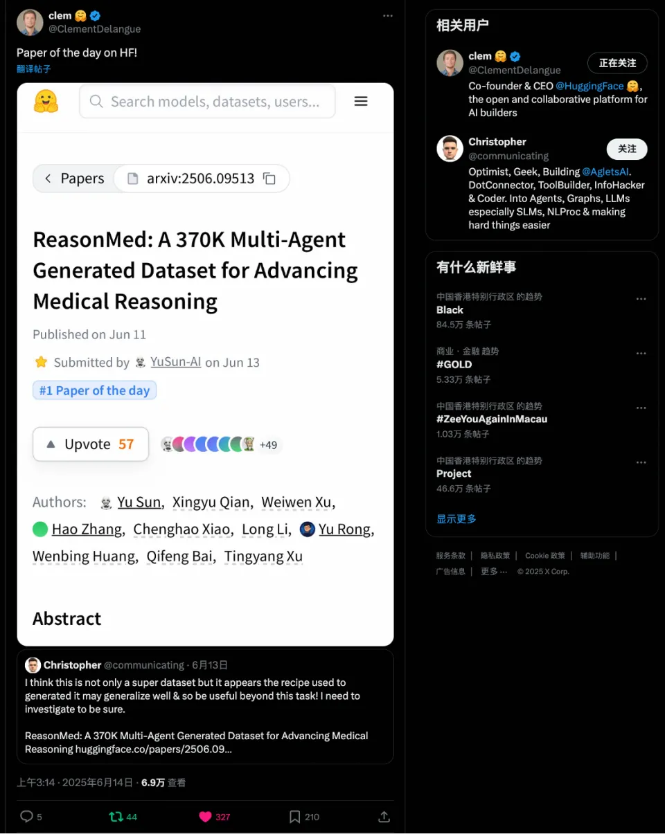 ReasonMed 发布后在社区内引发了积极反响。研究者普遍认为其「多智能体 × 分层调优」策略为高质量推理数据生成提供了新范式,并在 Hugging Face 与社区获得了广泛关注。论文发布当天即登上 Hugging Face「Paper of the Day」榜首,并获得 Hugging Face CEO 在 X 平台的转发与推荐,引发了业内研究者与开发者的热烈讨论。