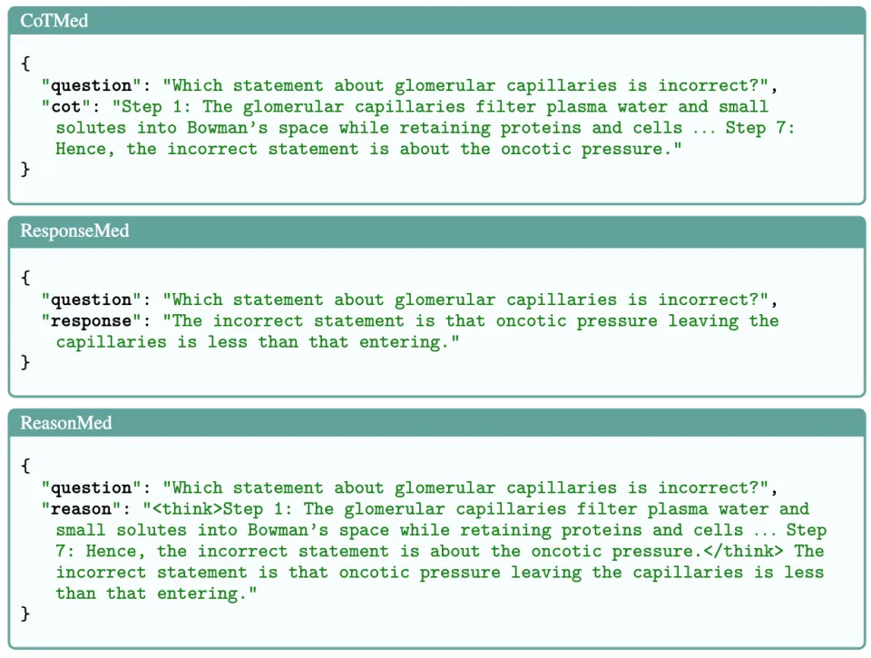 CoTMed370K 保留原始的详细推理轨迹,重点训练模型复现多步推理过程与思维逻辑,使模型学习复杂医学推理的链式结构;