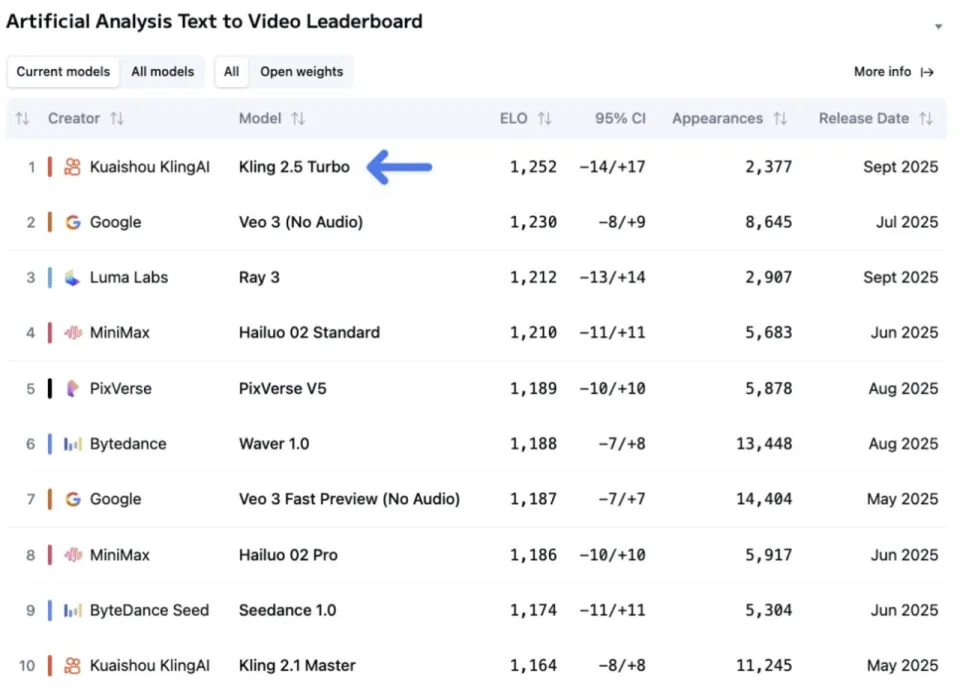自 2024 年 6 月问世以来,可灵 AI 迅速崭露头角并成为业内标杆之一。短短一年多的时间,可灵已经迎来 30 余次版本更新,几乎每次都能在创作者圈中引起轰动。最新版本 Kling 2.5 Turbo 在文本响应、动态效果、风格保持、美学效果等维度均有大幅提升,API 价格也较上代大幅下调 30%,更是一度拿下 Artificial Analysis 视频榜单第一名。