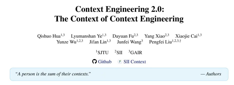 10月30日,上海交通大学和 GAIR 实验室发表了论文《上下文工程 2.0:上下文工程的上下文》,用一种更全面的视角定义了这个新兴学科。它不再把人机交互视为技巧,而是回归到了交流动力学的基础逻辑。