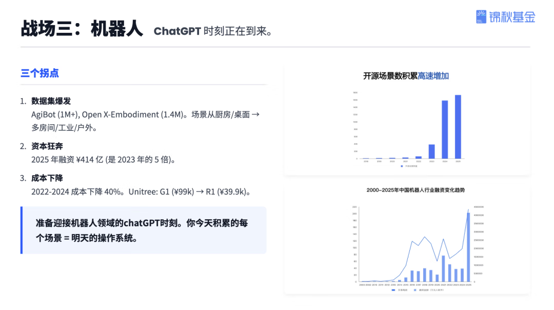 2025 年整个市场的融资额 414 亿,是 2023 年的 5 倍,我们自己的感受也很深,比如说我们投资的星尘智能、地瓜机器人等公司在很快的时间内完成了后续几两轮融资。