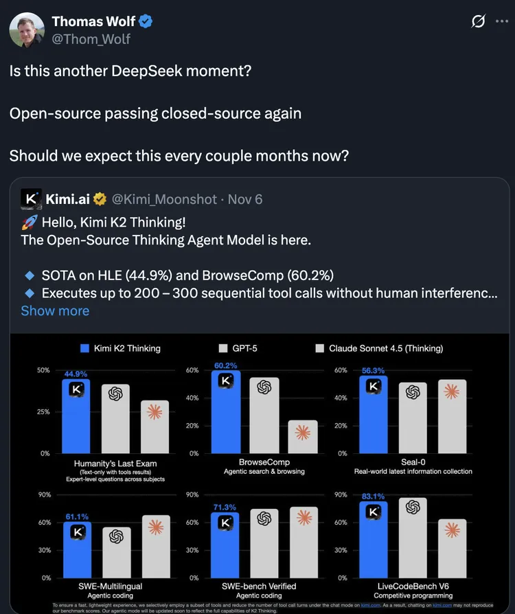 2025年11月6日,Hugging Face 联合创始人 Thomas Wolf 在 X 上的感慨,精准概括了Kimi K2 Thinking模型发布后所引发的讨论。