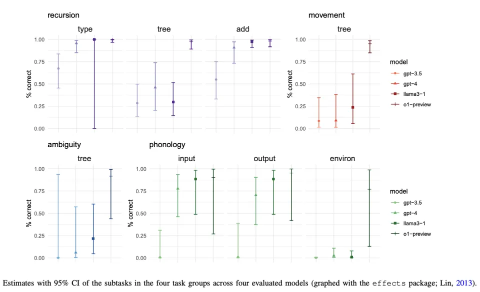 然而该研究表明,o1可正确识别两种结构,并为每种生成了符合语言学规则的句法树。其他模型(如 GPT-4、Llama 3.1)只会生成不合语法的结构,还会对语义产生误解。