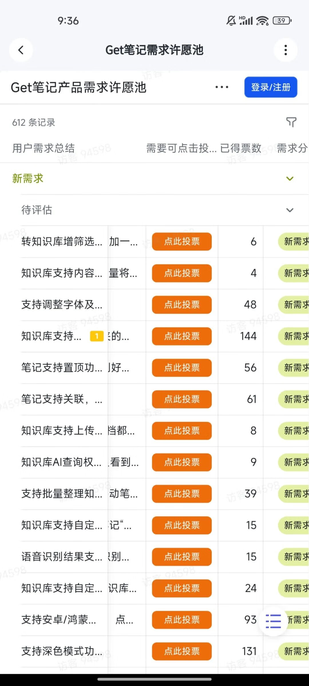 打开Get笔记“我的”页面,能看到所有用户提的需求(群里的反馈或用户自己添加的),其他用户可以投票。