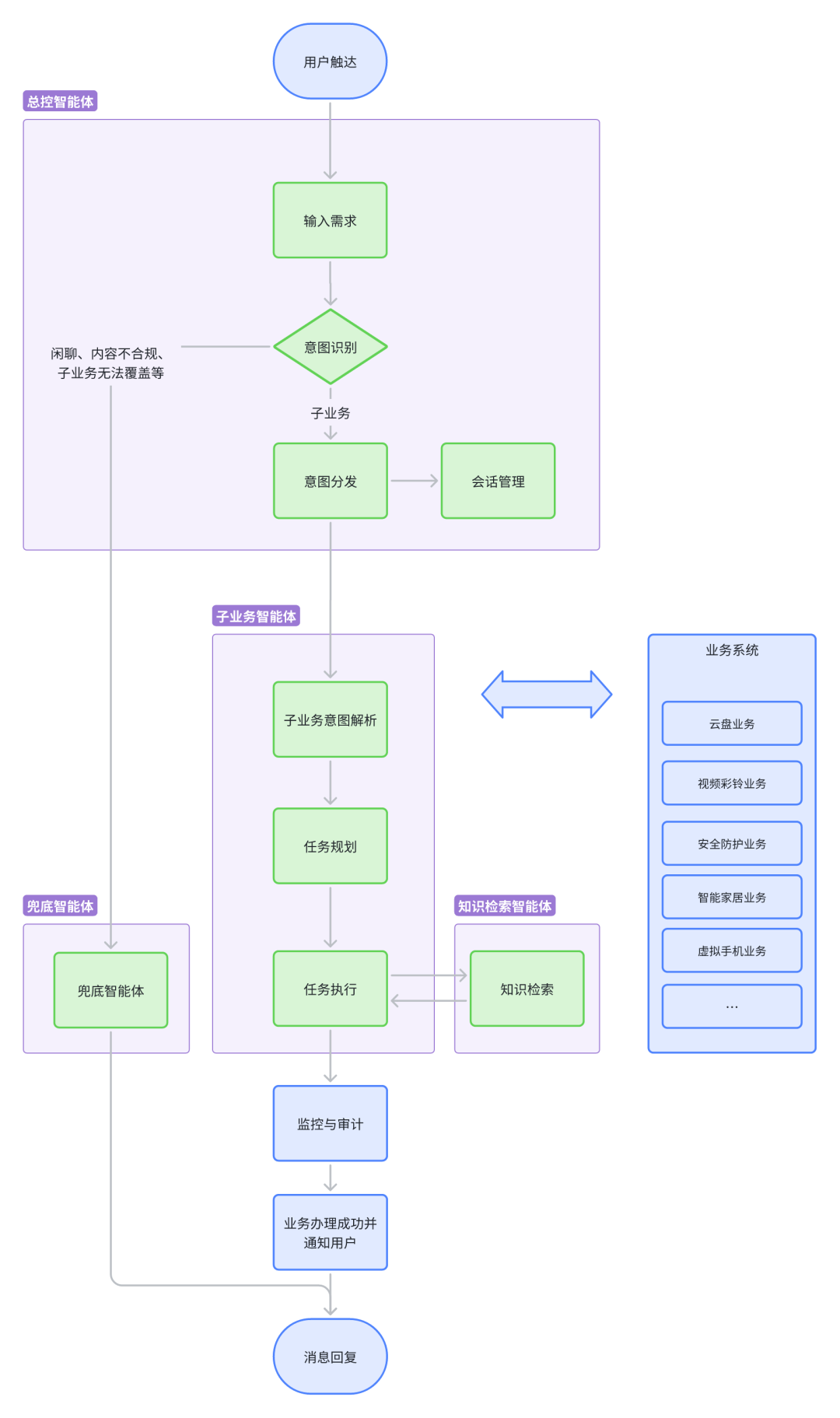 Step4子业务意图分发 & 合规管理:若需求合规且意图明确,意图识别智能体将需求分发至对应的子业务智能体,并同步进行合规性校验(如权限检查、流程合法性等)。