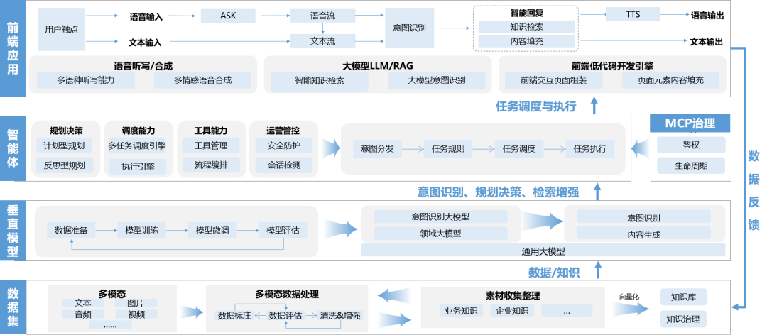 前端应用层支持语音和文本输入,通过ASK模块进入语音/文本流处理,经意图识别后调用智能检索(含知识库内容填充),最终通过TTS或文本输出结果,同时涉及前端低代码开发引擎和页面元素内容填充。核心的智能体层具备规划决策、调度能力、工具能力和运营管控四大模块,负责意图识别、规划决策、检查增强,并通过任务调度与执行流程(含角色分发、任务规则、调度、执行)驱动系统运转,MCP治理提供鉴权和生命周期管理。
