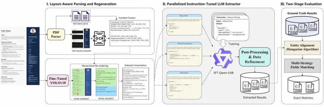 首先,通过OCR技术和PDF元数据完成文本提取,结合版面检测模型重建文档的阅读顺序。系统使用的版面检测模型是基于YOLOv10。然后,利用大型语言模型将提取出的文本内容转换为结构化的字段信息,包括基本信息、工作经历、教育背景等。