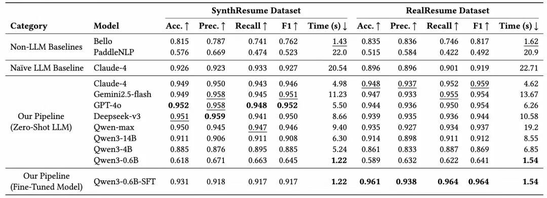 根据官方发布的性能对比数据,在SynthResume和RealResume两个数据集上,SmartResume的管道(尤其是微调模型版本)在准确率、精确度、召回率和F1分数等关键指标上,均优于非LLM基线和朴素LLM基线方法。