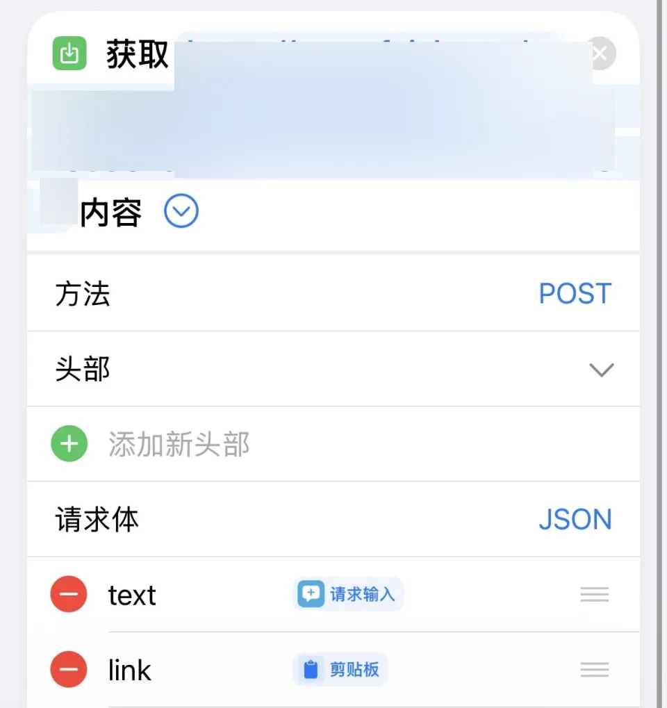 内容是我们通过请求输入获取的,而链接是通过剪贴板获得的,所以在text和link的后面,分别填上请求输入和剪贴板,就能对应到相应的文字和链接了。