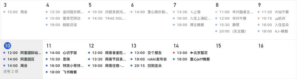 所以没法用手机日历,只能用飞书日历来同步我的日程,给大家看看我的日程的复杂度。