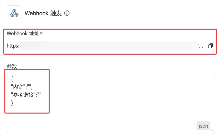 点击了webhook触发之后,你会看到一个webhook地址,和一个需要你手动填写的参数。