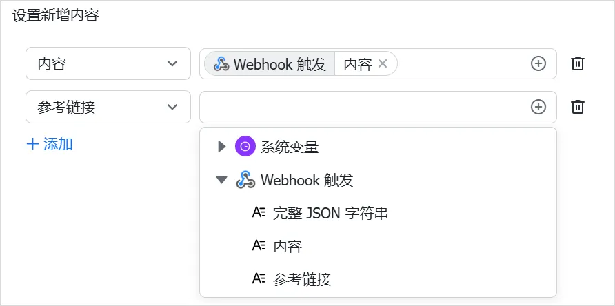 设置新增内容这里,我们要把表格里的字段,和刚刚写过的webhook参数一一对应。