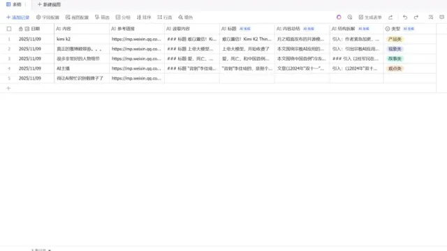 我可以通过字段捷径里的AI能力来给文章分类,总结内容,提炼结构。