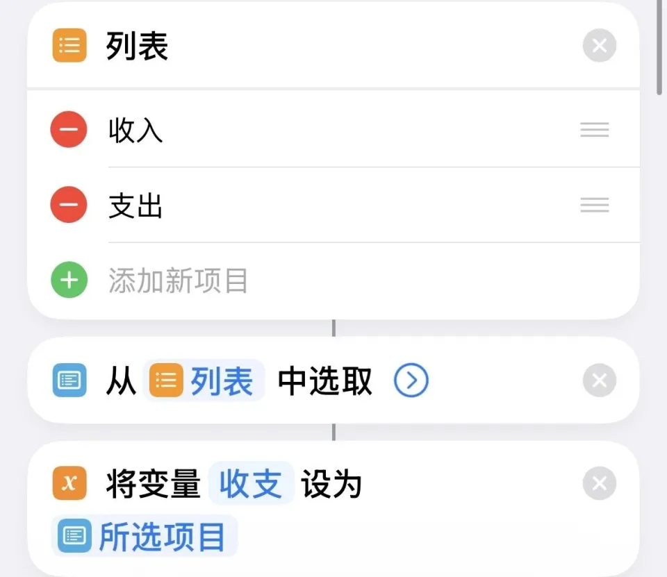 接下来,添加一个从列表中选取的操作,这样我们就可以选择收入或者支出。