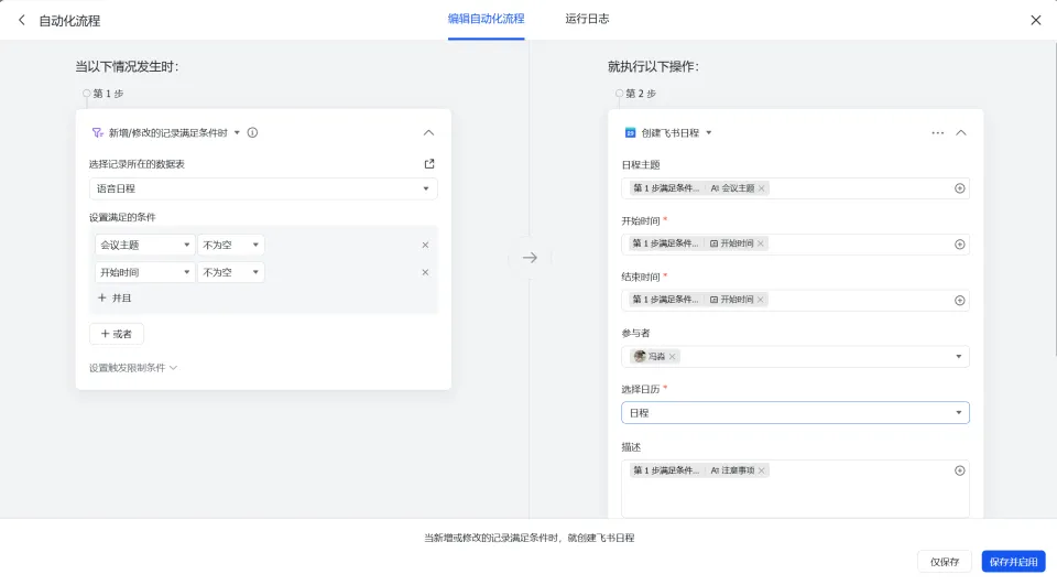 点击表格右上角的小机器人,打开自动化流程,然后设置一个把记录添加到日程的操作,把所有的字段信息,按照飞书日历的格式自动化推送过去,就可以在飞书日历上面自动化的新建日程了。