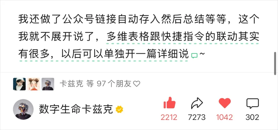 我想用这篇文章,带你们看看,飞书多维表格+快捷指令的组合有多牛逼,有什么有趣有意思的玩法。