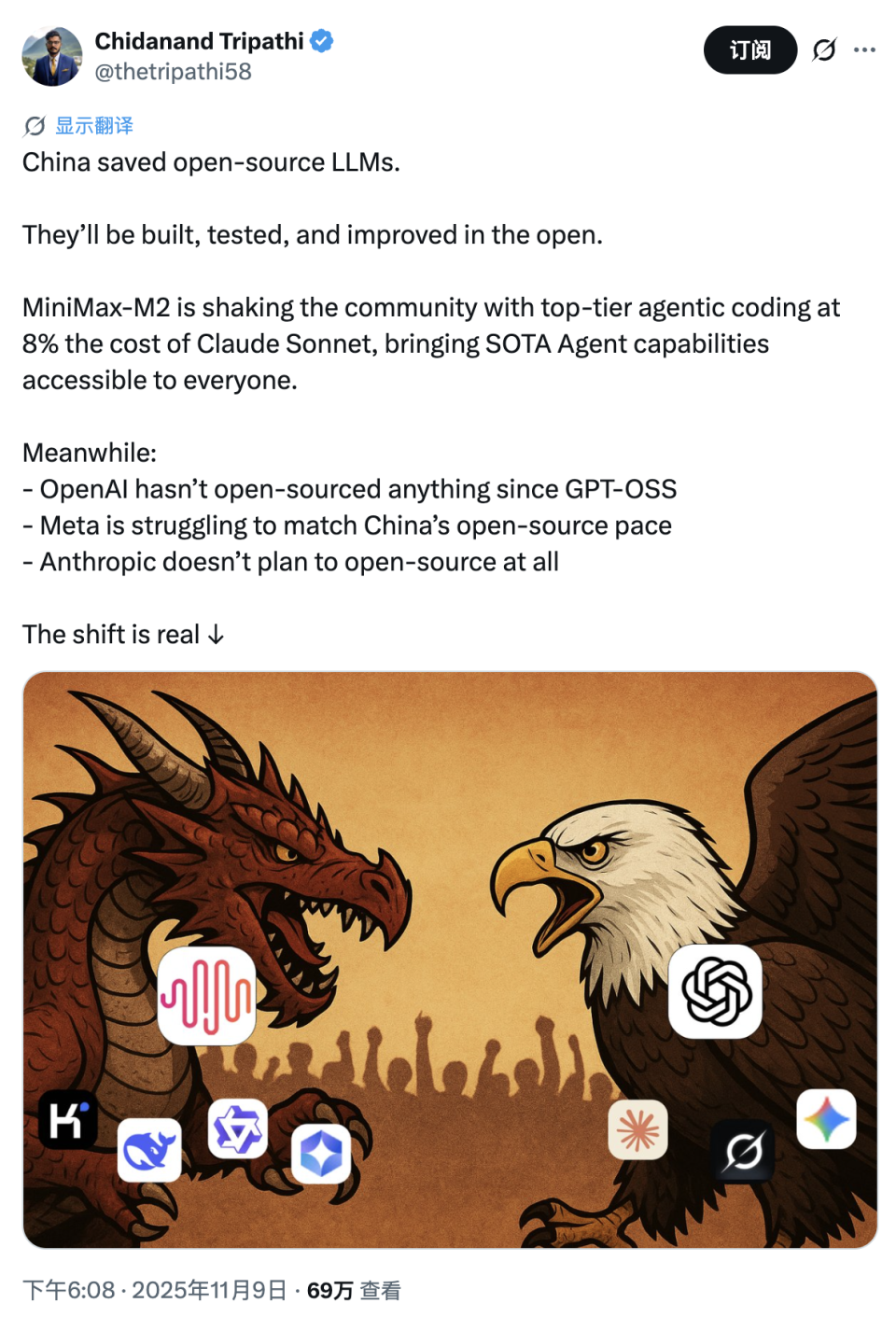 正如海外开发者在 X 上制作的一系列梗图:一边是标价 100 美元的 Claude,一边是标价 8 美元、表现却差不多甚至更好,用量更多的 M2。在一个正常的商业世界,会选谁自然不言而喻。