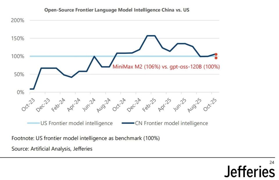 全球投行 Jefferies 在 11 月 11 日发布的最新 AI 报告中,用一组数据清晰地揭示了这种差异:中国头部 AI 公司(2023-2025)的合计资本支出为 1240 亿美元,仅为美国同行(6940 亿美元)的 18%。然而,中国最好的 AI 模型(MiniMax M2)的性能,仅落后于美国最好的模型(GPT5)10%。