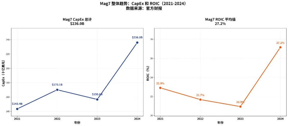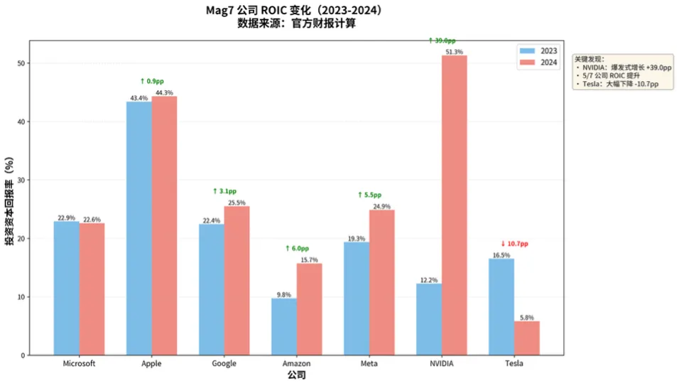 • Mag7 公司从 2023 年以来基本都大规模提升了 CapEx,且大部分 ROIC 都提升了。