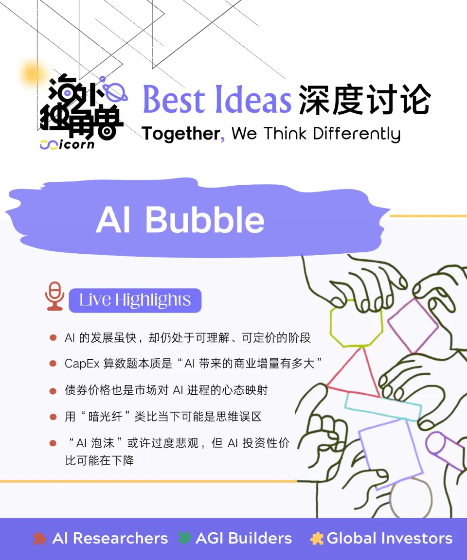 在这样的背景下,我们组织了一场聚焦「AI Bubble」的 拾象 Best Ideas 讨论会,沿着 OpenAI 和 M7 的巨额 CapEx、算力周期,数据中心的 ROI、以及 AI 技术范式的潜在黑天鹅等话题进行了理性讨论。