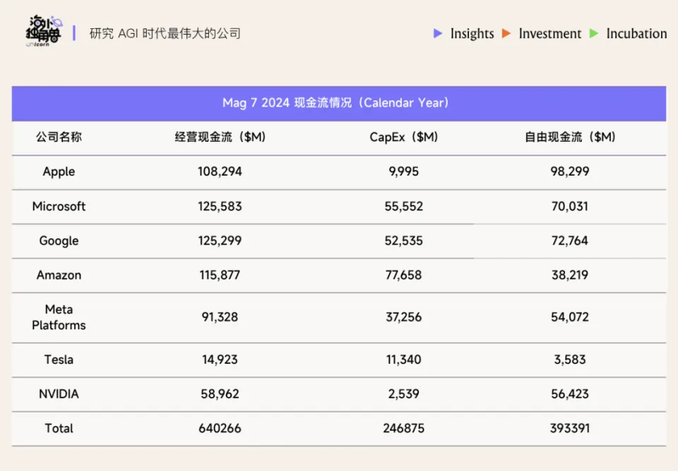 但这个缺口是没办法填上的。以 2024 年的 Mag 7 公司现金情况为例,在没扣除 CapEx 的前提下,Mag 7 账上现金总额约为 5000 亿美元,经营现金流之和约 6500 亿美元,换句话说,这些公司加总的现金流还不到 1.2 万亿美元。