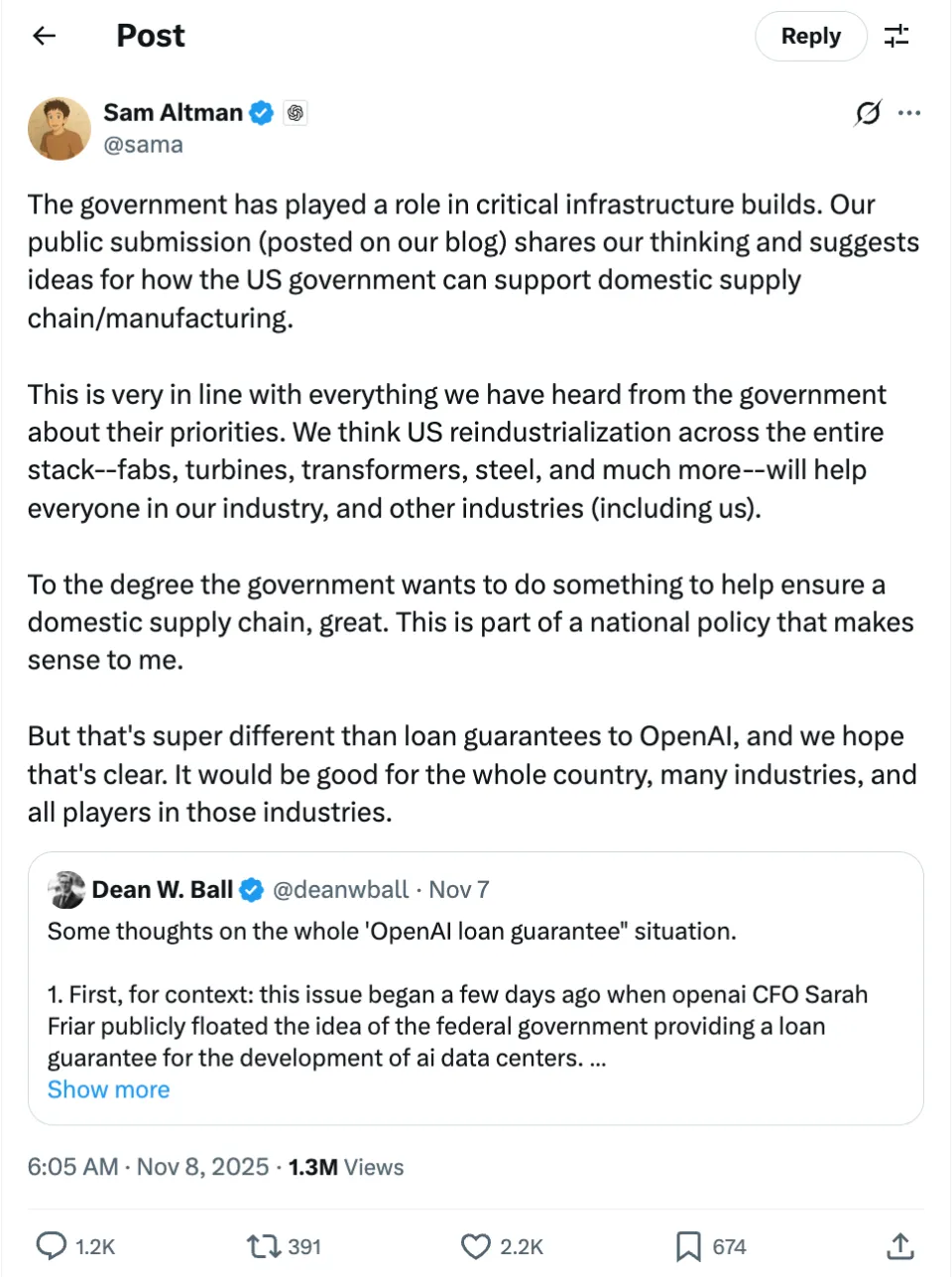 Sam Altman 在 X post 上表示希望美国政府支持 AI 基础设施建设。