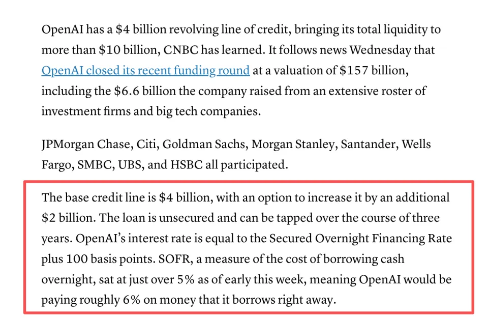 市场对 AI 进程的心态其实已经反映在了债券价格中:例如,xAI 的债券利率从 12% 提高到 13% 才成功发行;OpenAI 的借款成本约为 6%;而 Google 的发债利差也在 SOFR 基础上增加了 60 个基点。