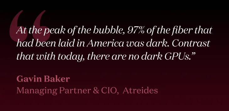 如果以暗光纤的逻辑评估 AI 泡沫,等价于现在的 GPU 有 90%或者 70%以上是闲置的,但实际上,现在市场上找不到闲置的 GPU。
