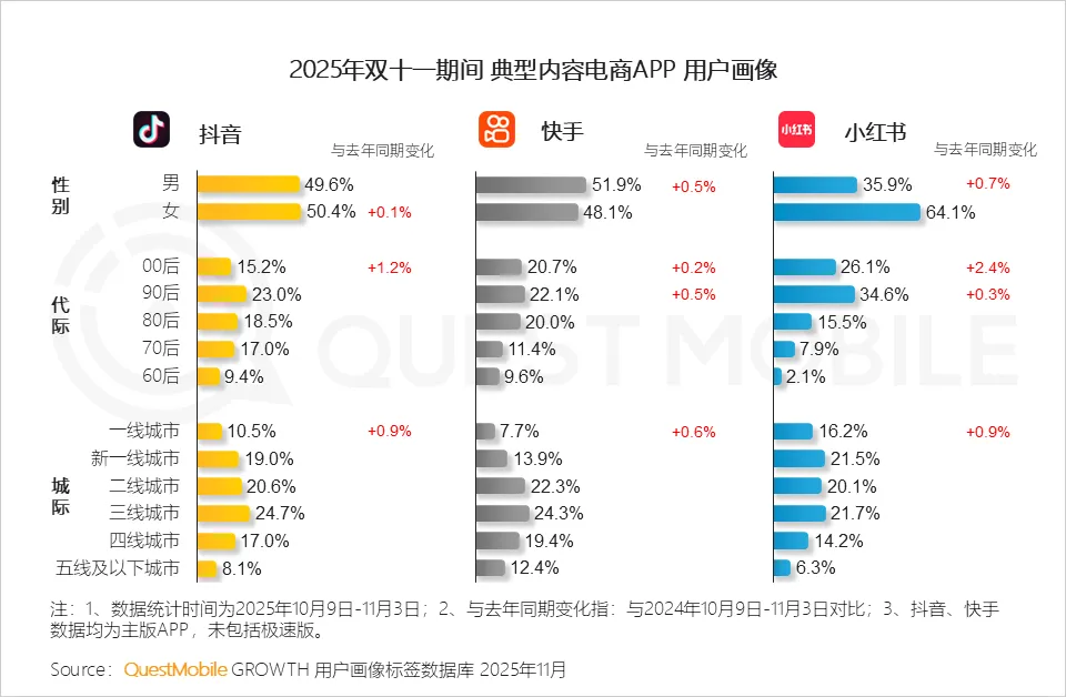 从用户画像上看,双十一期间,京东、小红书00后用户占比分别为18%、26.1%,同比分别增长了2.7%和2.4%,淘宝、拼多多、抖音的00后用户同比分别增长了1.4%、1.3%、1.2%……