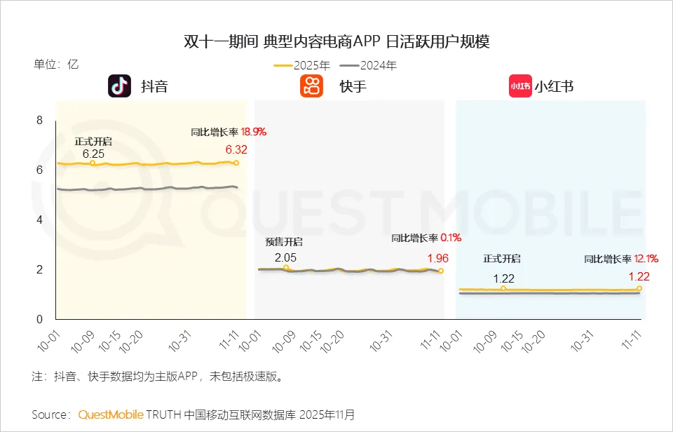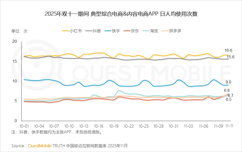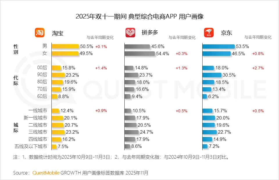 QuestMobile数据显示,2025年11月11日,淘宝APP流量同比增长4.2%,达5.08亿;拼多多APP流量同比增长2.5%,达4.14亿;京东APP流量同比增长9.8%,达2.27亿。