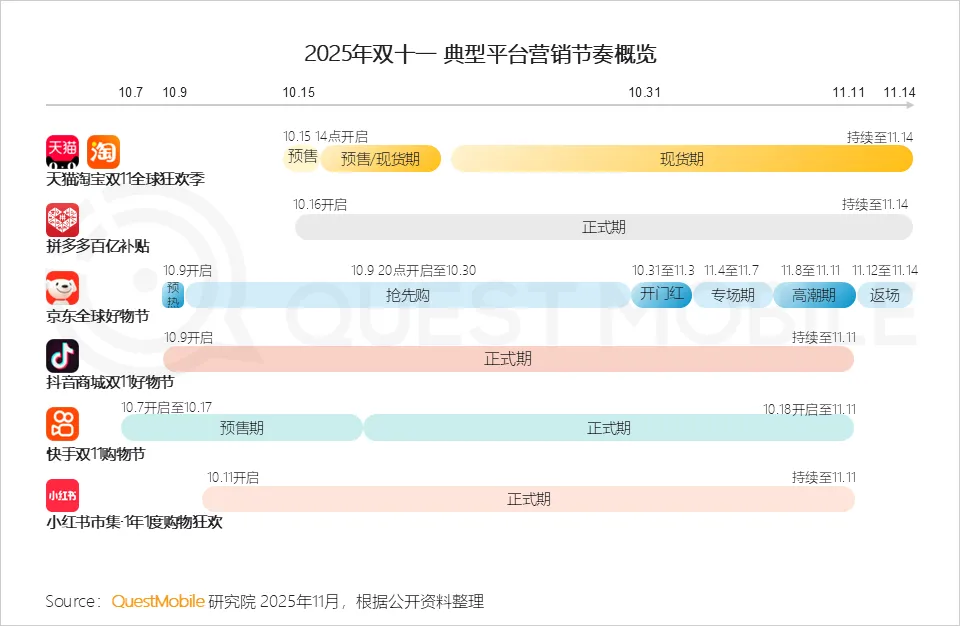 言归正传,今天就给大家分享一下 2025 年双十一快报。QuestMobile数据显示,2025年双十一基本形成了电商平台、内容平台两分天下的格局,双方为了实现蓄客,纷纷将开启时间拉长,快手连十一长假没过完就开始了预售,京东、抖音也从10月9日点燃战火,京东今年的双十一大促周期战线拉长至37天。