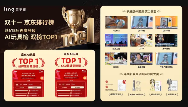 在商业化实证方面,灵宇宙可以说是行业的“隐形冠军”。团队倾心打造的随身AI终端“灵宇宙小方机”,刚上市就登顶618期间AI玩具及玩具总榜双榜第一。在刚刚过去的双十一购物节,“小方机”在京东和天猫等多个平台的榜单中名列前茅,并再度获得京东AI玩具“品牌累计榜单”和“SKU累计榜单”双榜第一,销售额同比今年618期间增长超230%。