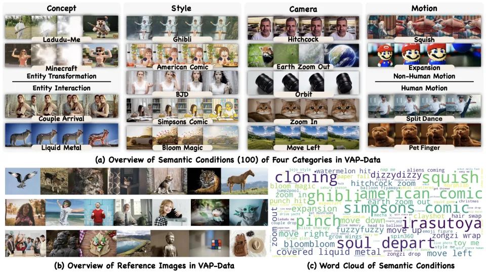 为了支持统一的语义控制视频生成,研究者构建并发布了 VAP-Data 用于促进相关研究大规模训练,和对应的 Benchmark 用于公平评测,这是目前开源用于语义可控视频生成的最大数据集,其中包含超过 100 个语义条件下的 100K 个精选配对视频样本。