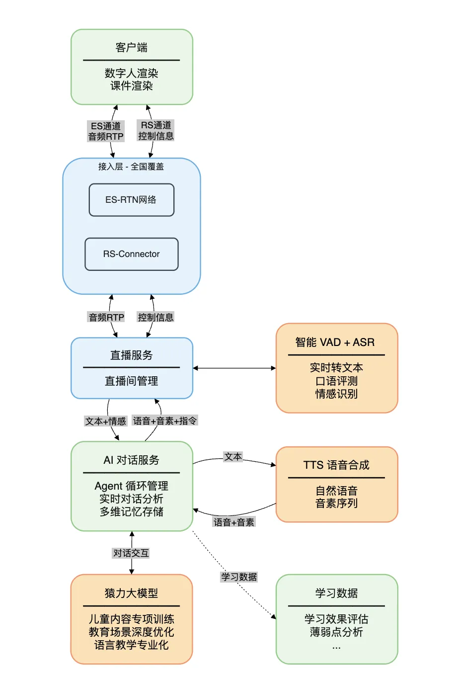 不过现实很骨感。一个完整的语音交互链路包括 ASR 语音识别(500-800ms)、大模型推理(700-1200ms)、TTS 语音合成(300-500ms),再加上网络传输(约 100ms),总延迟很容易超过 2.5 秒。这在教学场景下是不可接受的,因为孩子说完话等了好几秒 AI 才回应,学习节奏完全被打乱,专注度也会大幅下降。