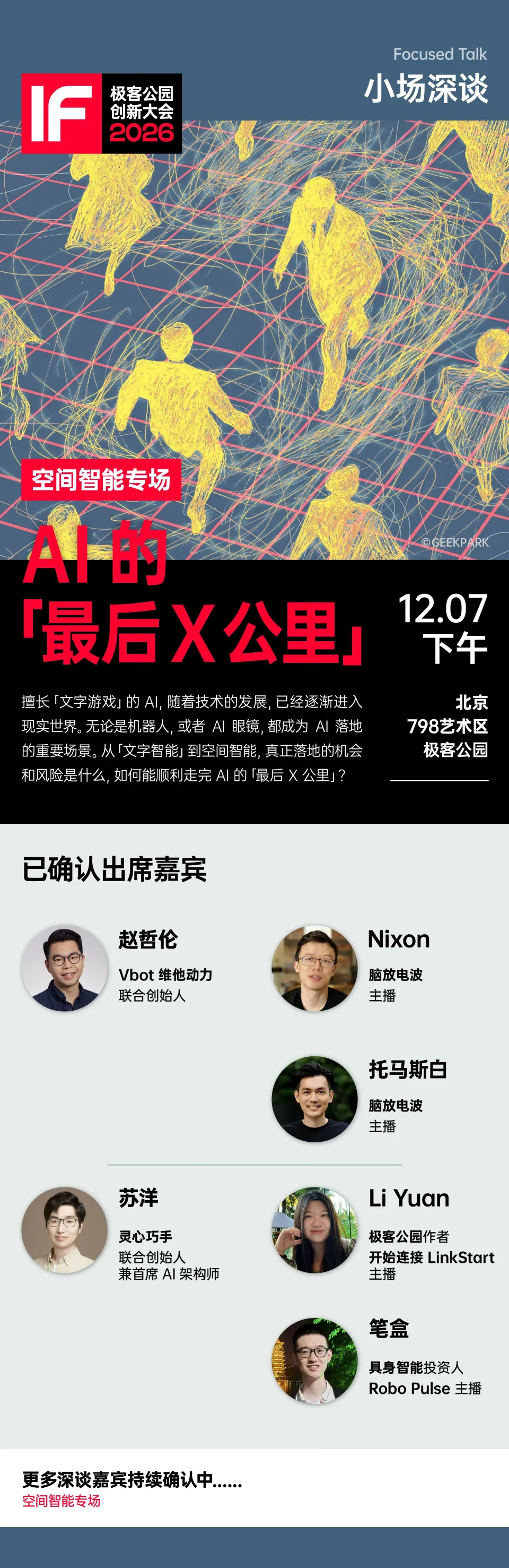 就在 12 月 7 号下午,分会场 B(极客公园),我们专门开一个「空间智能」的小场深谈。