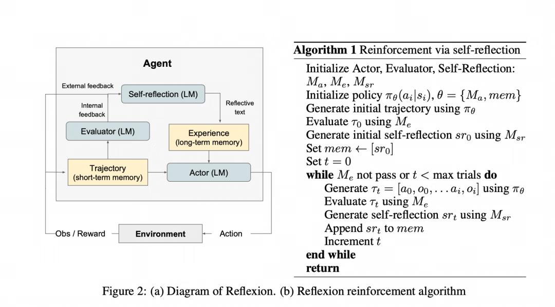 自我反思(Self-Reflection):核心组件,生成语言反馈并存入长期记忆,指导下次行动。